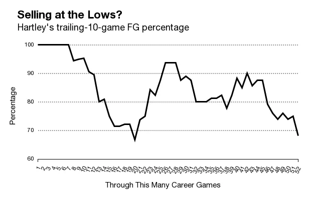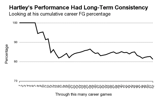 哈特利今年的糟糕表现——30次任意球尝试中成功22次——以及连续错失两个任意球所暗示的波动性,支撑了让他离开的理由。但数字并不支持圣徒队的决定。在我看来,球队在最低点解雇了踢球手,就像有人在股票低点时出售股票,而更为审慎的分析则认为这位挣扎的运动员可能会反弹。