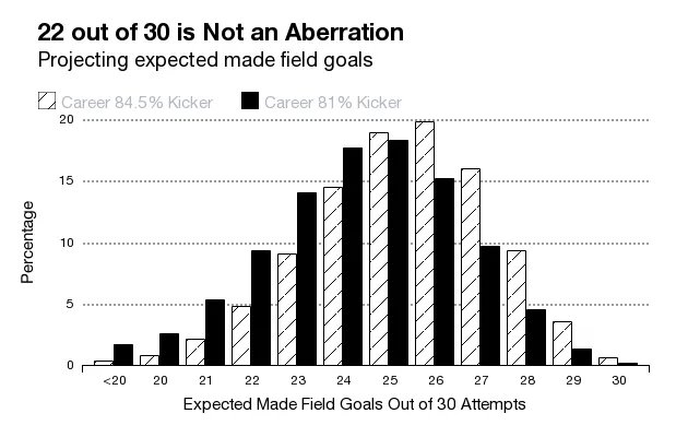 将 二项分布——在最近的一些 篮球分析中看到——应用于哈特利的成功率,显示出一位职业生涯成功率为84.5%的踢球手,在某个赛季中合理地预期会有22中30的平庸表现。84.5%可能是哈特利的“真实”百分比,而今年只是随机运气,就像连续几次抛出反面一样。也许他的“真实”职业生涯百分比是81%,在这种情况下,22中30是完全正常的。
