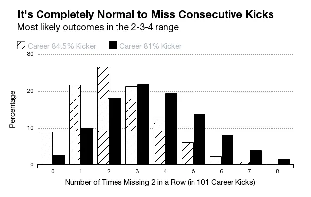 最后,就哈特利的波动性而言——例如在今年早些时候连续错失两个踢球——数字显示这也是完全可以预期的。平均而言,一名职业生涯命中率为84.5%的踢球手在101次尝试中会连续错失约两到三次。职业生涯命中率为81%的踢球手在101次尝试中会连续错失约三到四次。