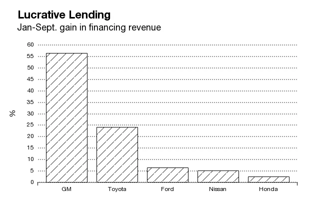 在今年的前九个月,通用汽车在其金融部门实现了7500万美元的营业利润,比去年同期增长了12.5%。丰田的贷款部门表现更好,在三个季度内获得了4200万美元的利润,增长了26%。与此同时,福特的汽车贷款在今年截至十月的收入微增2%,达到了2600万美元。