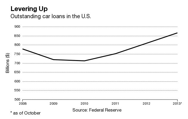 根据美联储的数据,2013年美国未偿还的汽车贷款总额增加了8.2%,达到了8660亿美元。以下是这笔债务随时间变化的情况:
