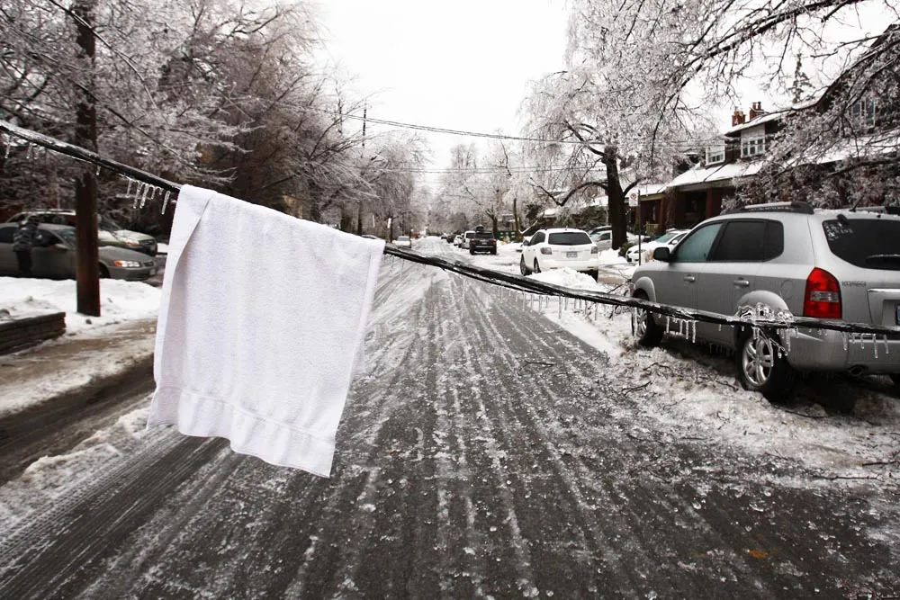 在2013年12月22日的冰雨后,一条白色毛巾被放在倒下的电线杆上,以提醒过往车辆,地点在安大略省多伦多。路透社/亨权·康