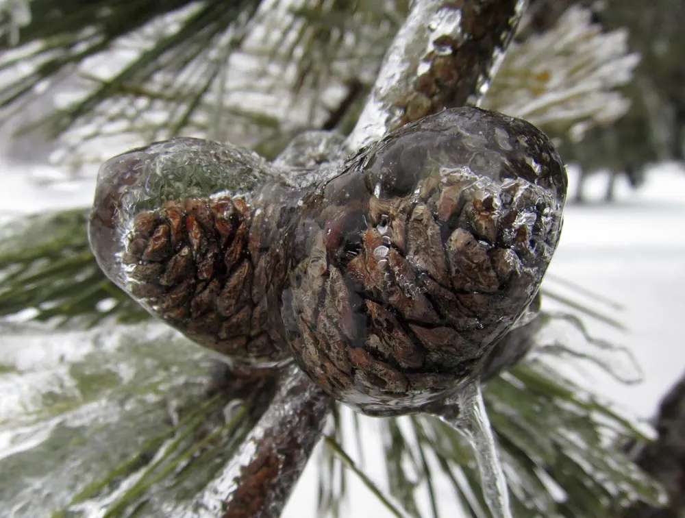 在2013年12月23日的冰风暴后,冰封的松果出现在厄尔·贝尔斯公园。路透社/加里·赫尔肖恩