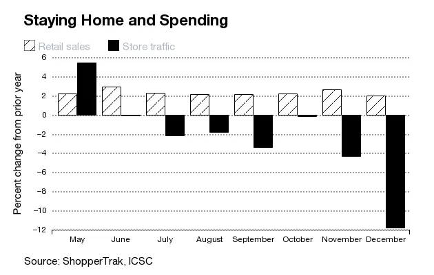 美国消费者在最近几周提供了很多线索,表明他们渴望在沙发上购物。感恩节假期期间的店内客流量和消费 在许多指标上都很惨淡。但根据 IBM的数据,“网络星期一”的在线购物比2012年增长了 21%。从大规模来看,这一趋势应该对任何愿意从轶事报告和半科学调查中放眼全局的经济学家或供应链顾问来说都是显而易见的。以下是一个30,000英尺的视角,显示过去七个月店内客流量一直在稳步下降。在此期间,美国消费者整体上花费的钱比2012年更多。
