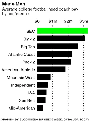 这些粉丝最终是流入SEC体育部门资金的来源,来自门票销售、许可,以及——最重要的是——媒体版权的销售。学校将这些资金用于教练,参与竞标战以获得和留住顶尖人才。下面的图表显示了平均主教练薪酬。(根据Glier的说法,力量和体能教练在顶级SEC学校也可以赚取数十万美元,但这里没有显示。)