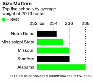 当他们在南卡罗来纳州到路易斯安那州的高中进行搜寻时,SEC教练最看重的是体型和力量。在一场又一场的冠军赛中,SEC球队凭借力量压倒了围绕“技术位置”构建的小型球队,主要是四分卫和接球手。“是大个子在欺负小个子,”Glier在*《SEC如何成为巨人》* 中写道。以下是2013年大学足球中按球员平均体重排名的前五支球队。猜猜哪个联盟有三支球队。