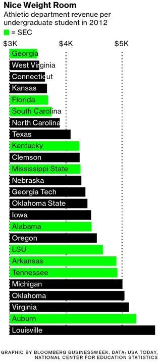 学校还花费数百万在奢华的体育设施上,使他们对招募者更具吸引力。根据《后中等教育成本的德尔塔成本项目》,SEC的支出最高(PDF),在2010年每位运动员为163,931美元。大12联盟以131,286美元位居第二。下面是另一种衡量SEC学校在资源方面领先的方式。它显示了按其体育部门每位本科生产生的资金量排名的前25所美国大学和学院——这些资金随后可用于设施、教练、设备等方面。前25名中有10所是SEC学校: