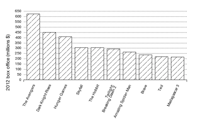 更重要的是,那些从事发布安排黑暗艺术的人能够更好地分散电影的数百万票房。2013年没有哪部影片能与*《复仇者联盟》或《黑暗骑士崛起》相提并论。即使是钢铁侠和凯特尼斯·艾佛丁也无法跟上。但有很多令人惊讶的表现出色的影片,比如《重力》,它创下了十月上映的记录,以及《冰雪奇缘》*,它迅速成为华特·迪士尼有史以来最赚钱的动画电影之一。 以下是2012年十大电影的回顾: