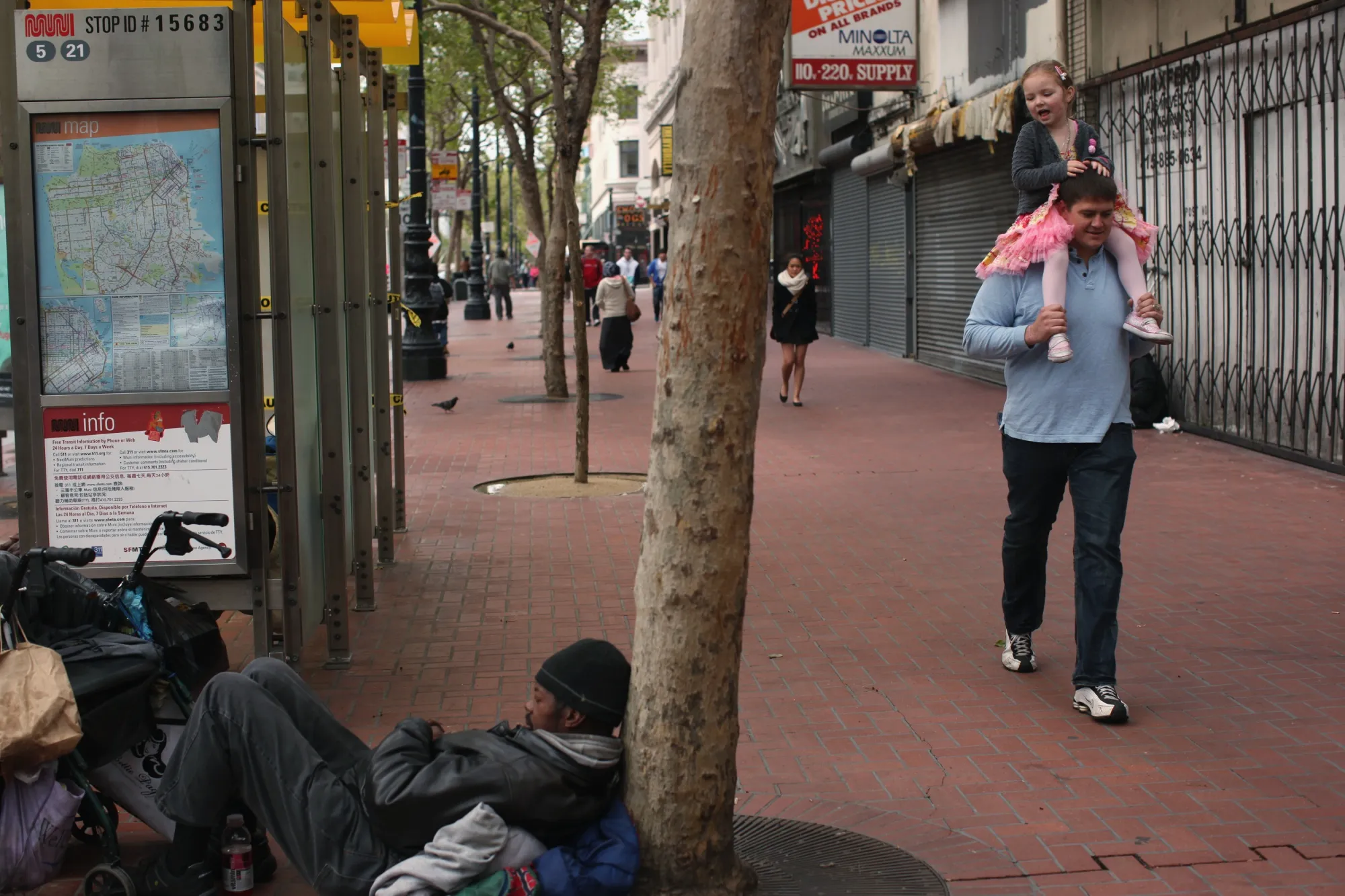 一个抱着女孩的男人走过在旧金山Tenderloin区市场街上睡在路边的男人。罗伯特·加尔布雷斯/路透社**"崛起,Tenderloin"**加里·卡米亚,*旧金山杂志,*2013年10月26日
