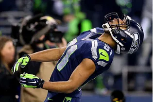 西雅图海鹰队的外接手戈尔登·泰特在2014年1月19日西雅图的NFC冠军赛中,跑卫马肖恩·林奇打入40码达阵后庆祝吃彩虹糖。罗纳德·马丁内斯/盖蒂图片社我所有的赌注都输了:那个忘恩负义的西雅图线卫和最有价值球员马尔科姆·史密斯显然没有感谢任何人;杰瑞·琼斯也无处可寻;而活动的粗俗商业化并没有在场边的彩虹糖上体现出来。但这没关系:我在第一场比赛中赚了大钱,并且在最后一次达阵中又赚了一笔。