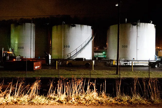 在西弗吉尼亚州查尔斯顿的埃尔克河上的美国水务厂,紧急救援人员在清理工作期间照亮的化学罐。摄影:Ty William Wright/《纽约时报》通过Redux在1月9日的化学泄漏事件后,新的诉讼纷纷而至,该事件切断了西弗吉尼亚州查尔斯顿地区30万人口的水供应。现在华盛顿传来消息,污染代表了一种在全国范围内存在的威胁。