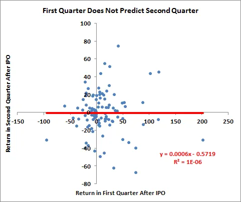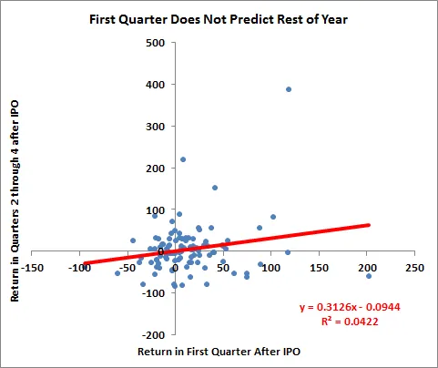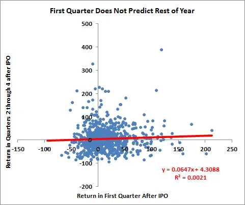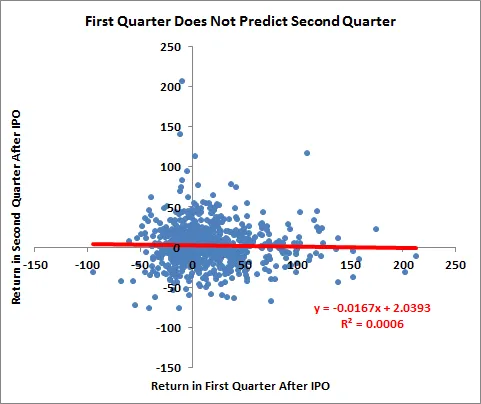 根据2005年至2013年间800家美国IPO的数据(我查看了超过1亿美元的发行,定价在5美元或以上,且公司至少有一年的数据),我们可以看到,新上市公司的股票在头三个月的表现基本上对未来的表现没有任何指示作用。
