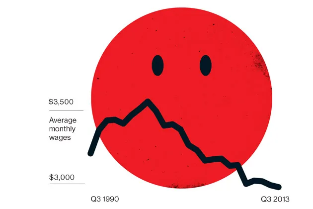 在过去15年中,工资下降了15%。截至2013年11月的11个月中,平均工人的工资仅上涨了0.2%。家庭的实际收入在12月比去年下降了1.7%。基础工资(不包括加班和奖金)在12月下降了0.2%,这是连续第19个月下降。富士通研究所的经济学家马丁·舒尔茨表示,工资问题“是安倍经济学是否有效或崩溃的试金石。”