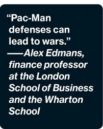 哈哈,这到底叫什么? 它真的叫做吃豆人防御。追溯到1982年,当时马丁·马里埃塔用它来抵御一个不受欢迎的报价,这一策略仅被尝试过几次。乔斯·A·班克拒绝了反报价;然后男士服装店提高了出价,并表示将直接向乔斯·A·班克的股东进行游说。现在这两家零售商都已实施了毒丸防御——旨在阻止收购的条款。
