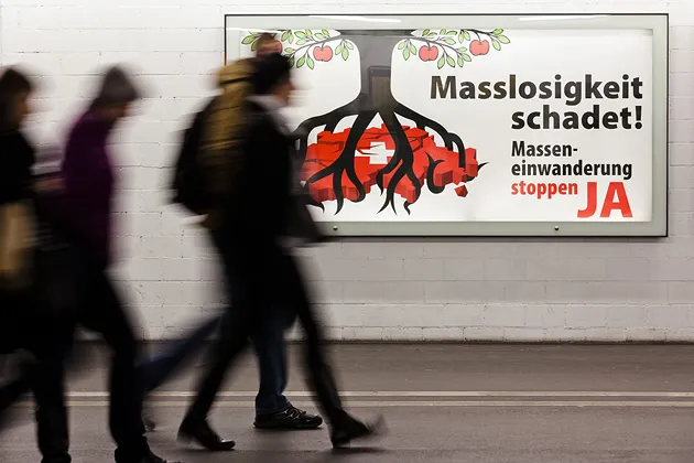 在苏黎世举行的2月6日“停止大规模移民”公投的选举海报摄影:迈克尔·布霍尔泽/法新社通过Getty Images瑞士正在引入可能是移民改革历史上最危险的实验之一。