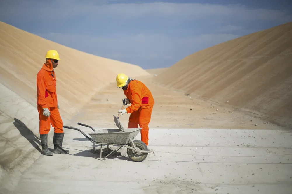工人在佩尔南布科州的卡布罗博市附近,对正在建设的运河之一进行小修小补,目的是将水从圣弗朗西斯科河引流,2014年1月24日。路透社/乌斯莱·马塞利诺