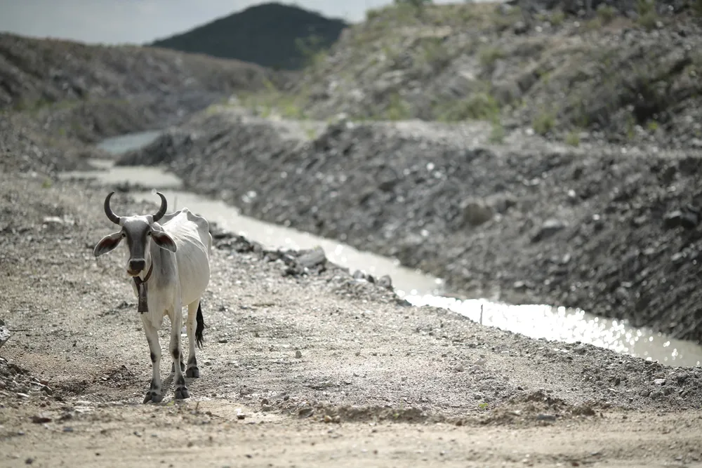 一头牛在佩尔南布科州的库斯托迪亚市附近,沿着正在建设的运河之一走动,目的是将水从圣弗朗西斯科河引流,2014年1月25日。路透社/乌斯莱·马塞利诺
