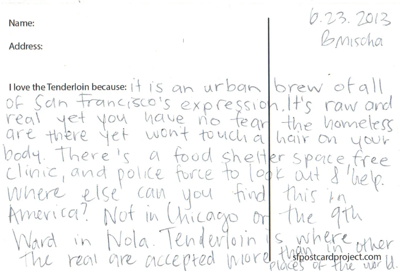 社区明信片项目想象一下:你住在旧金山,有一天,一个陌生人的明信片出现在你的邮箱里,上面写着:“Tenderloin 不仅仅是毒品和交易者。这里住着超过 5000 个孩子!包括我 4 个月大的女儿。”