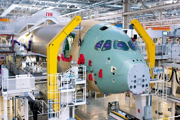 公司在调试A350上投入了前所未有的资源——这被称为“降低风险”。成功可能帮助空客主导市场。在过去的15年里,空客和波音均分了1000亿美元的全球客机市场,目前每家公司都有5000架的订单积压。如果A350项目一切顺利,布雷吉尔表示,这款客机“将占我们收入的40%,可能至少持续20到30年。”这架飞机目前已经为全球创造了12000个就业岗位,预计在生产高峰期将增加到16000个。“这是一个巨大的投资,”布雷吉尔说。