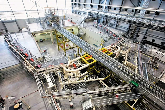 A350不会独占市场。在较大端,它将与波音最近宣布的777X竞争;在较小端,则与梦幻客机竞争。到目前为止,A350的表现良好。到2013年底,空客已收到来自37个客户的817个订单——在美元价值上超过了梦幻客机在其发展相应阶段的订单。推动乐观情绪的是波音的竞争对手777X的出现,尽管它并不是全新设计,而是一架90年代的飞机,配备了新的机翼和发动机,这与空客曾尝试在A350上采取的方式相同。 在与杜谢办公室相对的L形机库中,一架单一机身的飞机尾部朝向门口,位于100英尺高的空间内。最后一架测试飞机MSN005刚刚装上机翼,正在等待发动机。工人们在地面上走动,或爬上夹在飞机中部的黄色箱形脚手架。