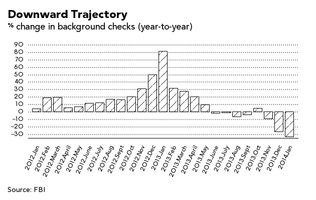 与此同时,行业正处于创纪录的高点。背景调查在2012年12月桑迪胡克小学大屠杀后达到顶峰,因担心更严格的枪支管制法即将出台。但这样的立法并没有真正出现,背景调查在夏季开始下降。
