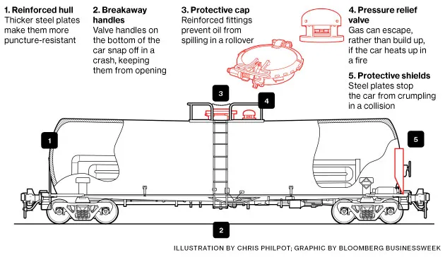 石油公司并不急于接受这一请求,他们也不必这样做,因为旧车厢符合当前的联邦指南。在美国,用于运输原油和其他易燃液体的92,000个罐车中,只有14,000个具备更新的安全特性。根据彭博政府的估计,改造这些车厢可能会使行业花费约52亿美元。一些石油公司正在提前应对可能出现的变化。2月6日,特索罗,美国最大的炼油公司之一,宣布将在2014年中期之前更换所有租赁的旧罐车。“这将会花费更多,毫无疑问,”高级副总裁基思·凯西说。“但简单来说,我们认为这是正确的做法。”