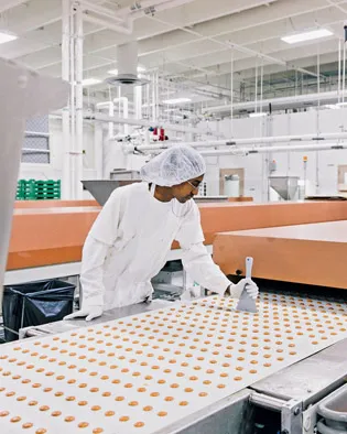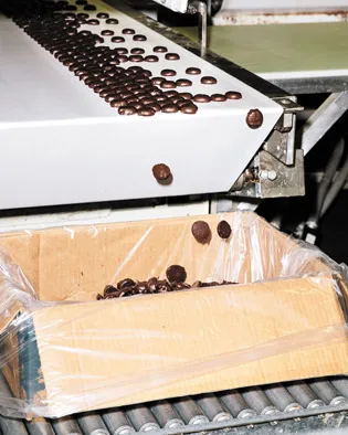 在一个巧克力通过传送带出来的车间,工人们必须尽快将巧克力从模具中取出并放回传送带,就像经典的 我爱露西 一集一样。拉塞尔·斯托弗(Russell Stover)的一些糖果仍然是手工浸制的,但最需要个人关注的是原材料。工厂的一些机器接近50年历史,由于它们用于制作多种不同类型的巧克力——一台机器可能一周在生产糖蜜糖,下一周则在生产焦糖方块——员工们花费大量时间对它们进行改装,以适应每次生产。