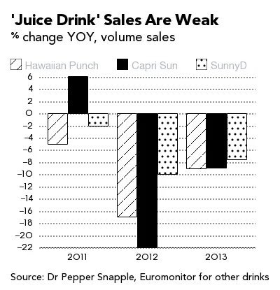 似乎越来越少的孩子想要一种老式的 夏威夷果汁。德克萨斯州的德克士饮料集团报告称,这种含有5%果汁的饮料,暗示着某种无法命名的水果口味,2013年的销量下降了9%,这是这个已有80年历史的品牌连续第三年出现负销售。