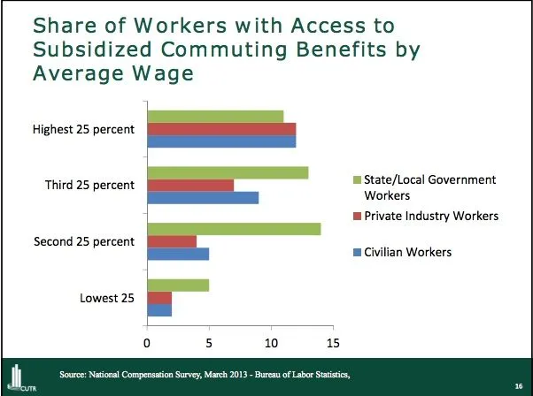 这就是为什么补贴福利尤其重要的原因。雇主可以通过简单地提高工资、补贴全额福利或在税前从工资中扣除福利来给予工人通勤福利。但这些选项远非平等。工人在补贴选项中获得的利益最大,而在税前选项中获得的利益最少(福利在税前从收入中扣除)。后者仍然很常见,因为这正是雇主获利的地方: