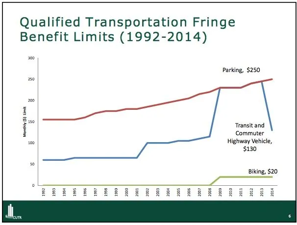 路透社国会最近未能维持通勤福利的平等,给予司机每月高达250美元,但将公共交通乘客的福利降至130美元。这一决定对双方都很糟糕——公共交通乘客显然受损,但司机也一样,因为单人通勤的激励将增加交通拥堵——但这不应该令人感到惊讶。事实上,少数短暂的福利平等年份是例外,而不是常态: