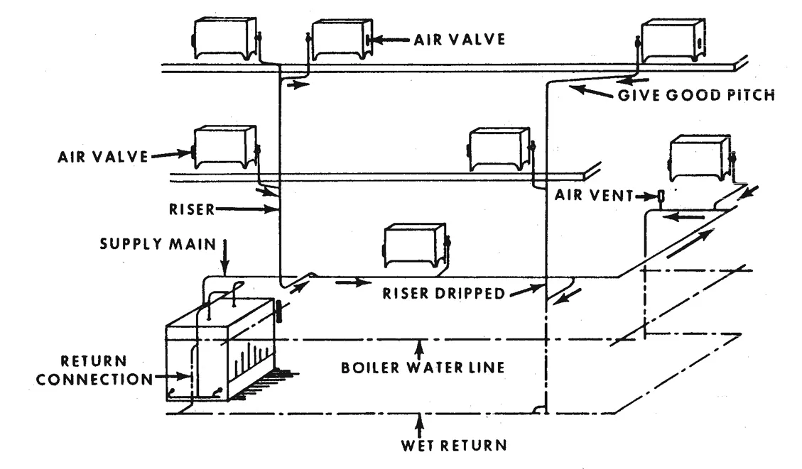 一旦空气阀达到一定温度,它会发出咔嗒声关闭,让散热器冷却。当蒸汽阀冷却时,它会再次打开,释放出更多冷空气。这反过来又将热蒸汽吸上来。剩余的水滴沉到底部的散热器,并沿着管道滴回地下室的锅炉,在那里水被重新加热。
