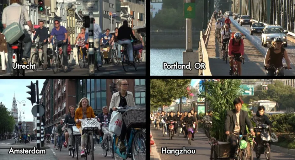 这段短视频充分展示了骑自行车的普遍吸引力。但埃克森指出,一旦你观看几段片段,就会明显看到一个戏剧性的对比。在那些骑自行车是常规交通方式的国家,拥有广泛、良好连接和保护的基础设施,人们很少佩戴头盔。而在美国城市,汽车仍然占主导地位,自行车道相对新颖,大多数骑自行车的人都佩戴头盔。(你还会看到其他骑行风格的差异。)
