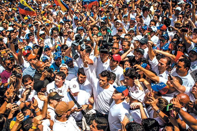 洛佩斯在卡拉卡斯的支持者中,时间是2月18日摄影:梅雷迪斯·科胡特/彭博社身披委内瑞拉三色旗,反对派领袖莱奥波尔多·洛佩斯,42岁,站在卡拉卡斯东部查卡伊托地区的何塞·马蒂雕像上,结束了他对数万名欢呼支持者的七分钟演讲。在提醒他们正在为“年轻人、学生……整个委内瑞拉人民”而战,并呼吁“群众的非暴力斗争”后,他告别时对着手持麦克风喊道:“很快,我们将拥有一个自由和民主的委内瑞拉!上帝保佑你们!”
