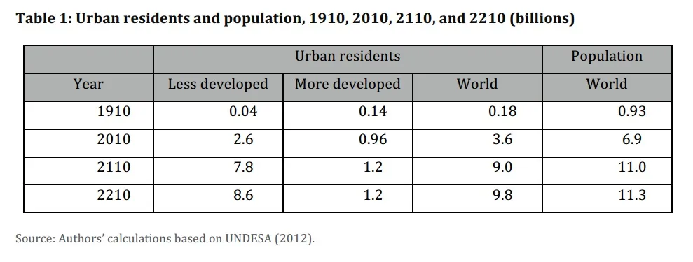 这一城市人口增长的主要部分将在未来一百年内发生,使21世纪真正成为城市世纪。富勒和罗默预测,到2110年,全球城市人口将从36亿增加到大约90亿。根据他们的研究,整体人口增长以及城市人口增长将在此之后开始趋于平稳。