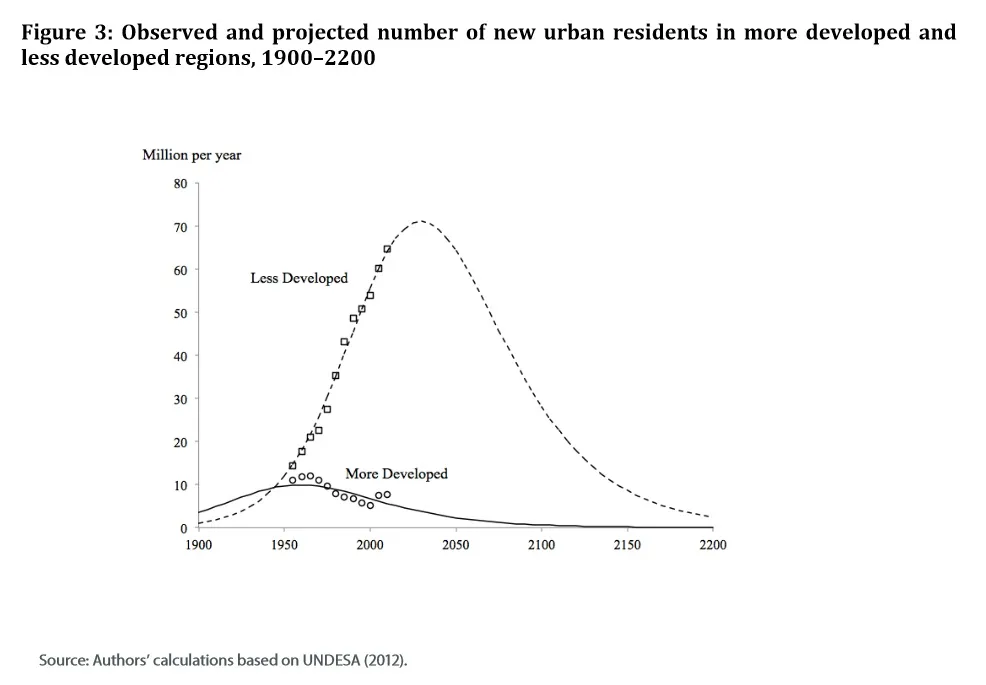 下面的图表来自他们的工作论文,向我们展示了为什么城市扩张是发展中国家的一个特别问题。正如他们所指出的,“剩余的城市化过程主要是[欠发达地区]的现象,而且主要是本世纪的现象。”