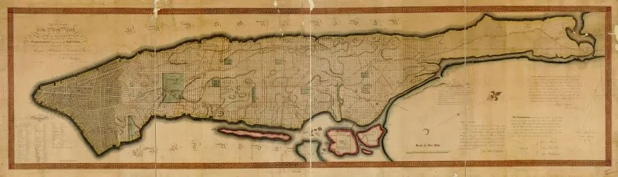 威廉·布里奇斯1811年“纽约及曼哈顿岛地图,由立法机关任命的委员会于1807年4月3日绘制”,基于约翰·兰德尔的测量。美国国会图书馆,地理与地图部。更早的例子,作者提到19世纪曼哈顿街道网的扩展。尽管岛的下部,即使在今天,仍然是殖民时期非正式城市规划的产物,但城市规划者为城市的其余部分施加了更系统的街道网。扩展计划的范围相对狭窄,因为它仅仅设定了街道和公共及私人空间的界限,而没有指定任何特定的密度或用途。但它最大化了纽约市早期政府的力量,通过征用空地作为街道,并规定土地所有者为经过其财产的道路支付费用。这一前瞻性的计划,既有限又深远,是今天试图扩大城市空间以容纳新城市居民的城市的一个典范。