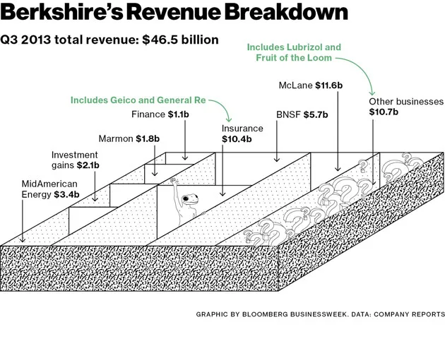 近年来,这意味着涵盖资本支出、股息以及对 IBM 超过100亿美元的投资等主题。他还更新了董事会在选择他最终接替者作为首席执行官方面所做的工作。信件后面附有大约70页关于伯克希尔投资和数十个运营单位的数据和讨论。一些较大的子公司,如铁路公司伯灵顿北方圣菲和汽车保险公司Geico,有自己的章节。其他如Fruit of the Loom,在2012年底有超过26,000名员工,几乎没有被提及。