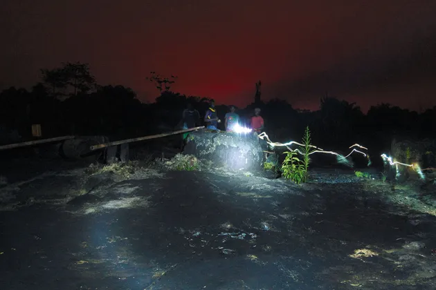 我们走的时候天已经黑了,四周很安静。唯一的声音来自鞋子踩在坚硬沙子上的声音和小组内的谈话。31岁的塞基博指着一些灌木丛,他说尼日利亚阿基普石油在这里泄漏了原油,毒害了植被。他的弟弟和表弟在他身边开玩笑,问塞基博关于他订婚破裂的事。“我有那么多女孩,我不需要结婚,”他自夸道。三人紧张地笑了。由于他们的村庄被认为是盗油的中心,军方频繁造访。在几天前的最后一次突袭中,士兵们在塞基博和其他居民支付贿赂后才离开。
