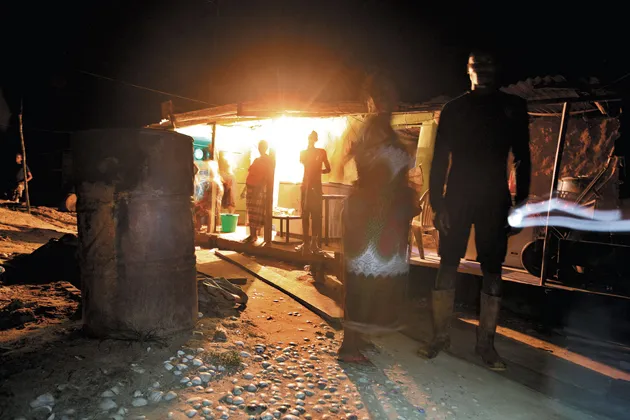清理工作也受到腐败的影响。例如,石油公司可以雇佣承包商。因此,一些社区的居民与承包商串通,破坏管道——不是为了偷油,而是为了给承包商提供更多的工作以获取回扣。其他人则仅仅将管道作为政治抗议的目标。“有些居民对公司在他们社区的发展上没有任何作为感到不满,”莫里斯说。“所以他们破坏管道,希望公司能与他们坐下来讨论社区发展项目。” 在村庄的骚乱之后,摄影师和我被带到我们第一次到达的码头附近一位社区领袖的家。我们被告知,直到早晨我们不能把船开出去(需要两个小时的航程)。在房子的门廊上,我们整夜观看领袖的手下将装满被盗原油的船只引导到码头,然后连接他们的长绿管将油泵入储存容器,以便稍后精炼。妇女们来回拖动装有原油和精炼油的油桶,从不断流动的船只中买卖。穿着头灯的油浸少年不知疲倦地用手推车运输从管道流出的油;巨大的火焰在他们身后燃烧,源于烹饪油的火焰。