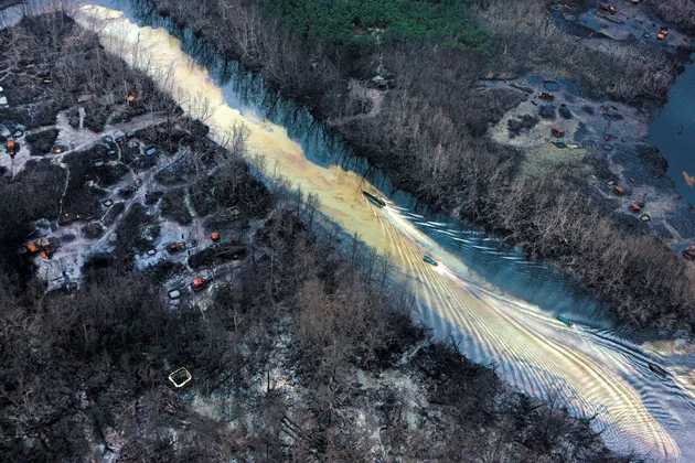 黎明刚过,当我们前往我们的船时,塞基博走到水边。河流曾经是蓝色的,如今在一层油膜下暗淡发光。高耸、纠结的树木和灌木丛矗立在早已吸收了泄漏物的腐烂土壤上。但此刻,黑烟已经散去。