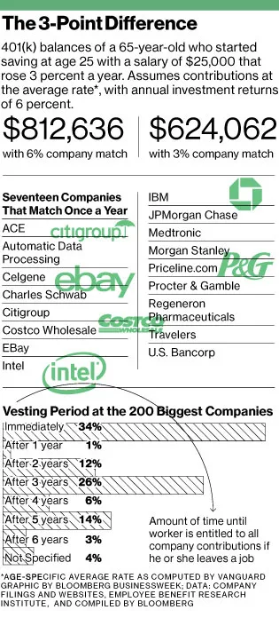 另一种节省成本的方式是公司将401(k)匹配推迟到年底,如AOL所提议的,或推迟到次年初。IBM去年转向在2013年进行一次性支付,理由是竞争压力。那些在12月15日之前离开公司的员工没有获得该年的匹配。摩根大通在2009年开始推迟匹配贡献。摩根大通的一位发言人拒绝对此举发表评论。