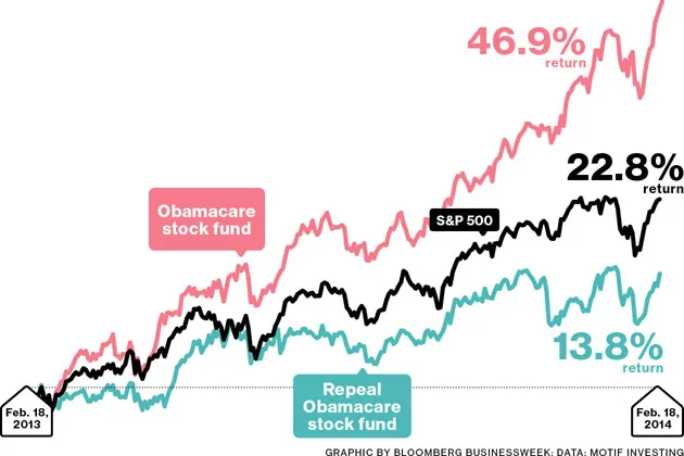 自2012年6月美国最高法院维持该法律的合宪性以来,医疗行业的投资激增。根据彭博分析师埃里克·巴尔丘纳斯的研究,专注于医疗的交易所交易基金的资产已从70亿美元翻倍至160亿美元。所有17个医疗行业ETF在此期间都有所增长,其中9个翻了一番。“我们无法确切知道这笔资金中有多少是纯粹为了为奥巴马医改布局,还是投资者对其他医疗趋势的乐观,”巴尔丘纳斯说。“但显然,奥巴马医改为这个炙手可热的行业的投资案例提供了一个主要催化剂。”