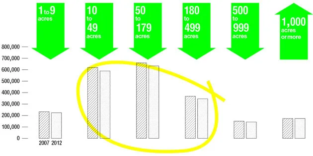 虽然农场的平均规模略微增加,从418英亩增加到434英亩,但普查显示美国中型农场持续萎缩。非常小型和非常大型农场的数量保持不变。