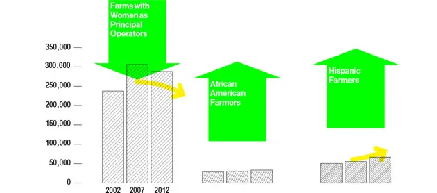 虽然86%的农民是男性,92%是白人,但少数族裔农民的数量有所增加,尤其是在西班牙裔中。在2002年至2007年间,女性农民数量大幅增加,但在最新的普查中,她们的数量有所下降。