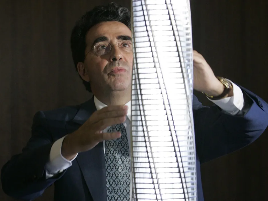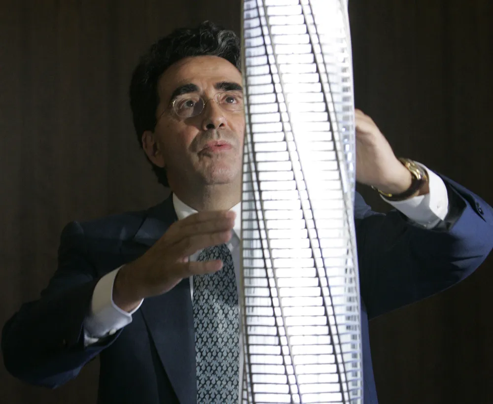 西班牙建筑师圣地亚哥·卡拉特拉瓦在谈论他设计的150层湖滨塔“芝加哥尖塔”时,查看一个模型,时间是2007年9月26日,地点是芝加哥的销售办公室媒体参观。美联社照片/查尔斯·雷克斯·阿博戈斯特