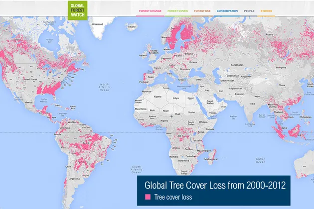 感谢世界资源研究所根据最近一项由马里兰大学和谷歌的科学家对卫星地图的 分析,地球在2000年至2012年间净损失了150万平方公里的森林——大约相当于蒙古的面积。不幸的是,仅仅在事后看到生态破坏的范围使政策制定者的选择有限。上周,位于华盛顿的环保非营利组织世界资源研究所、谷歌地球和其他合作伙伴推出了一种新的在线工具,全球森林观察,以提供关于全球森林覆盖变化的接近实时信息。