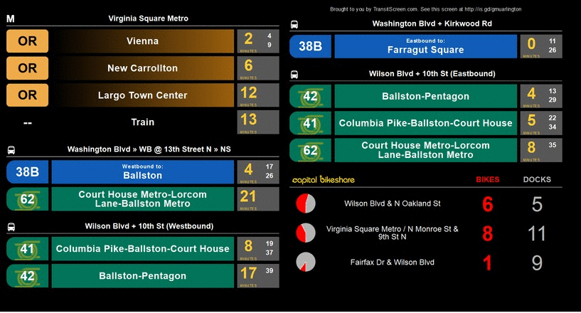 TransitScreen 源于 Mobility Lab,这是一个位于弗吉尼亚州阿灵顿的公民倡议,旨在鼓励驾车通勤者使用公共交通。在 那次试点之后,Caywood 和 Ryan Croft 推动将该服务商业化,目前在美国和加拿大的 14 个城市设有屏幕。Caywood 说,最近在交通研究委员会的一次会议上,TransitScreen 赢得了 六分钟推介比赛,引发了投资者的兴趣激增。