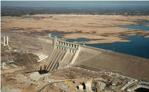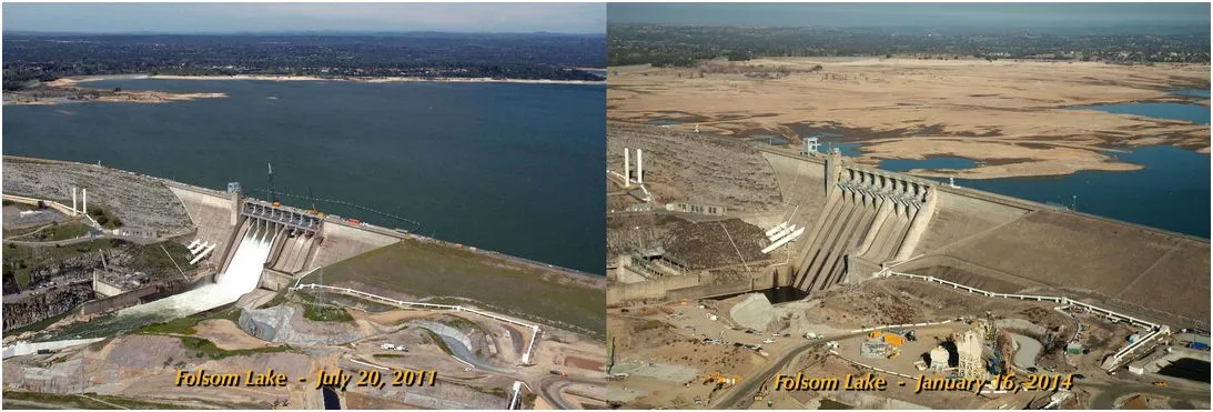 两年半前,这个水库的容量达到了 97%(并且是夏季历史平均水平的 130%)。但上个月就像有人拔掉了一个巨大的水槽塞,把湖水排成了沼泽。湖水的容量仅为 17%,而历史平均水平的 35%,其盆地的广阔区域呈现出附近福尔松大坝的混凝土颜色。