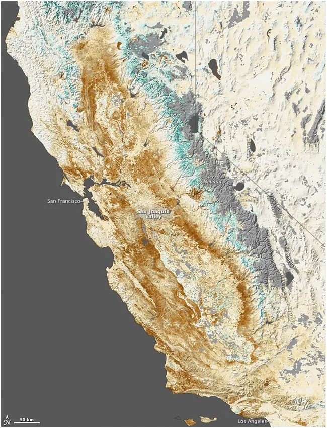 在州的中部,显示为棕色的巨大低于正常植物生长带延伸开来。与此同时,西 Sierra 山脉的植被生长则明显高于平均水平,如绿色所示。根据 一位 NASA 研究员的说法:“由于今年雪量不多,常绿植物显得异常绿色。实际上,这在这个时候是个坏消息。”