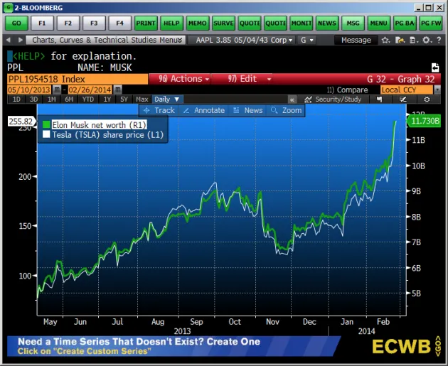 这张图表显示了马斯克的净资产自春季以来的急剧上升——尤其是自2013年底以来: